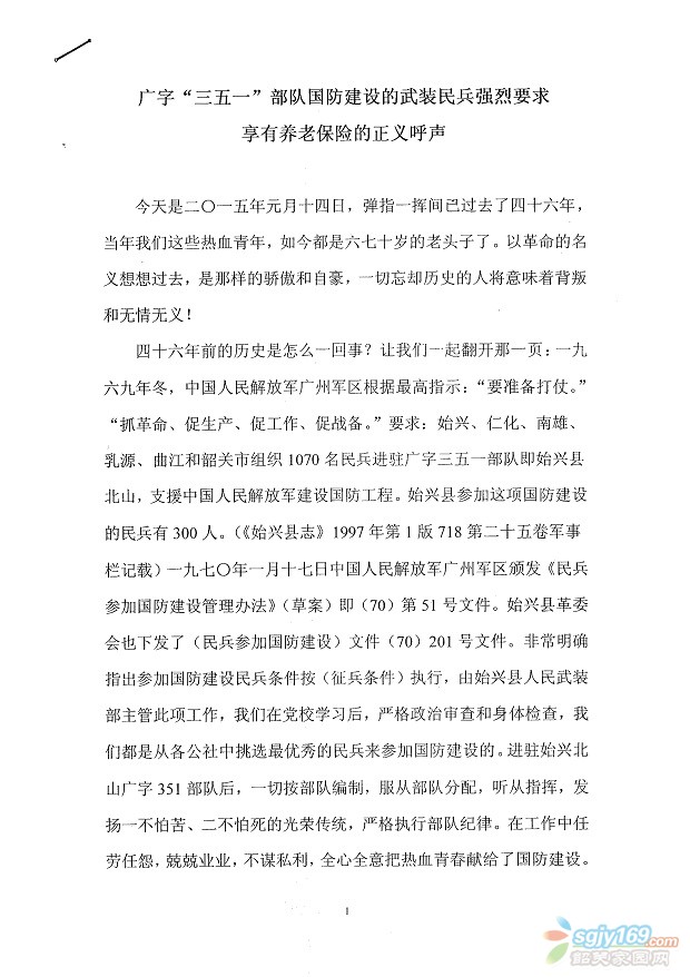 廣字"351"部隊(duì)國防建設(shè)的武裝民兵強(qiáng)烈要求享有養(yǎng)老保險的呼聲